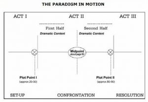 Primeiro Syd Field considera somente os filmes com aproximadamente 120 minutos, ou seja, longas-metragens de duas horas de duração, no momento de definir seu corpus de análise. A partir desta unidade considerada modelar, ele vai efetuar as marcas, os nós, que darão origem ao Paradigma. Suas bases encontram-se na segmentação imaginária da trama em três atos: uma APRESENTAÇÃO (unidade narrativa com aproximadamente 30 minutos), uma CONFRONTAÇÃO ( maior unidade narrativa, com 60 minutos) e, por fim, um DESFECHO ( unidade simétrica à primeira, com iguais 30 minutos). Se considerarmos as diferenças entre os formatos apenas como uma questão de escala, teríamos, mantidas as proporções das marcas, uma estrutura em curta-metragem de dez minutos, por exemplo, com a seguinte configuração: